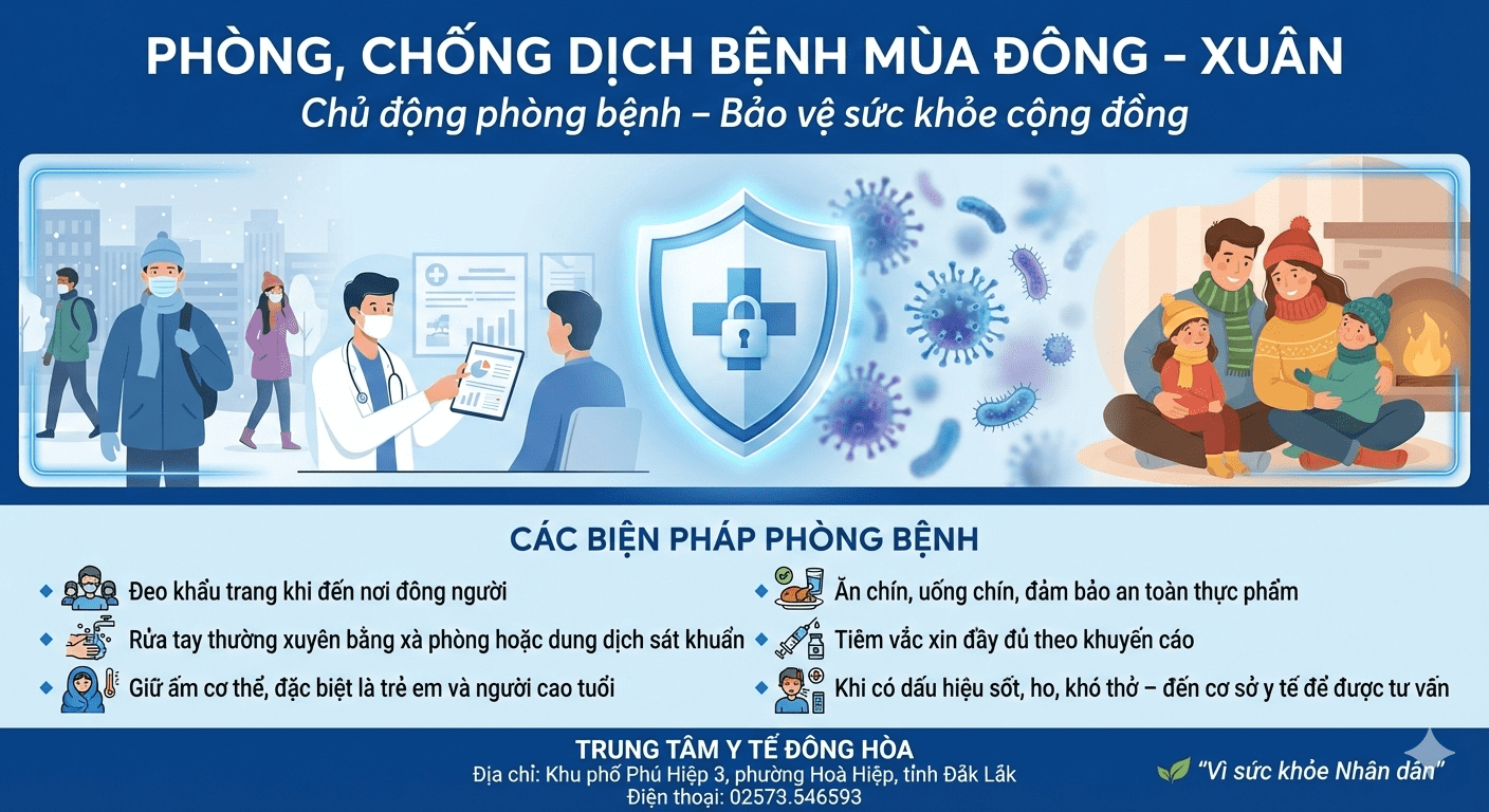 Trong thời điểm giao mùa đông – xuân, các bệnh truyền nhiễm có xu hướng gia tăng như cúm mùa, viêm đường hô hấp cấp, viêm phổi. Bên cạnh đó, tình trạng ngộ độc thực phẩm, tiêu chảy cấp, rối loạn tiêu hóa cũng thường xảy ra do sử dụng thực phẩm không đảm bảo an toàn.